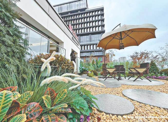 样板间外的“疗愈花园”同样引人驻足。潺潺流水、摇曳风铃与错落绿植共同构成一个宁静角落。工作人员表示,这片园林不仅美观,还能降噪20至30分贝、调节空气湿度,“我们希望能为忙碌的都市人营造一个让生活‘慢下来’的空间。”