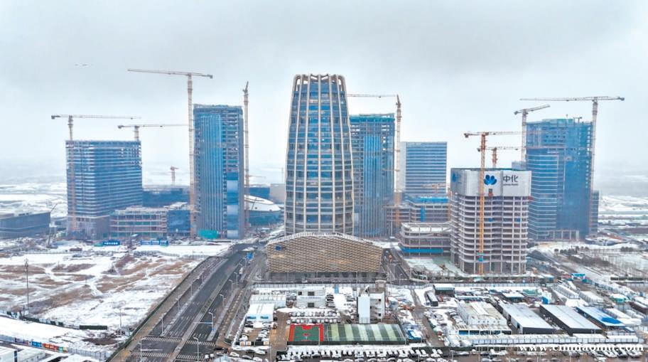 12月12日,雪中的雄安新区启动区塔吊林立,正在加快建设。