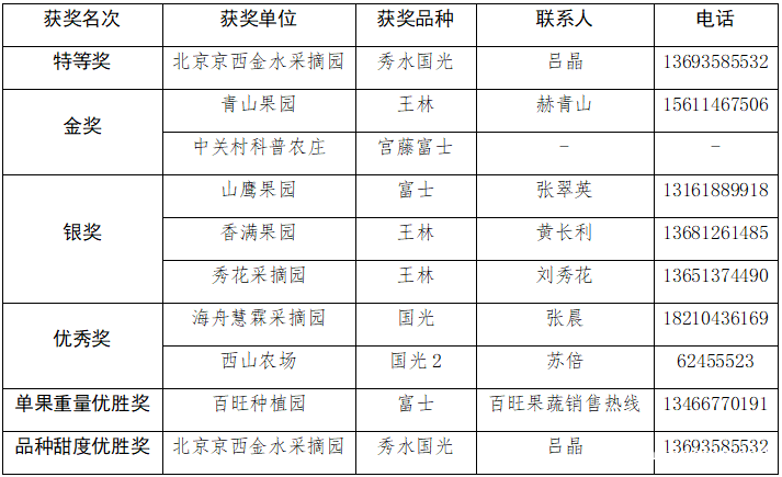经过综合评比,最终北京京西金水采摘园的秀水国光获得特等奖,平均单果重达272.5克,糖度高达18.1%,果型端正,风味浓郁,适合各种人群食用。同时评选出金奖2名、银奖3名及优秀奖2名。其中,百旺种植园的富士苹果以平均单果重385克的成绩获得单果重量优胜奖;北京京西金水采摘园的秀水国光以18.1%的平均糖度获得品种甜度优胜奖。此次参赛果品不仅品质出众,更体现了海淀区种植户精湛的苹果种植技术和对品质的不懈追求。
